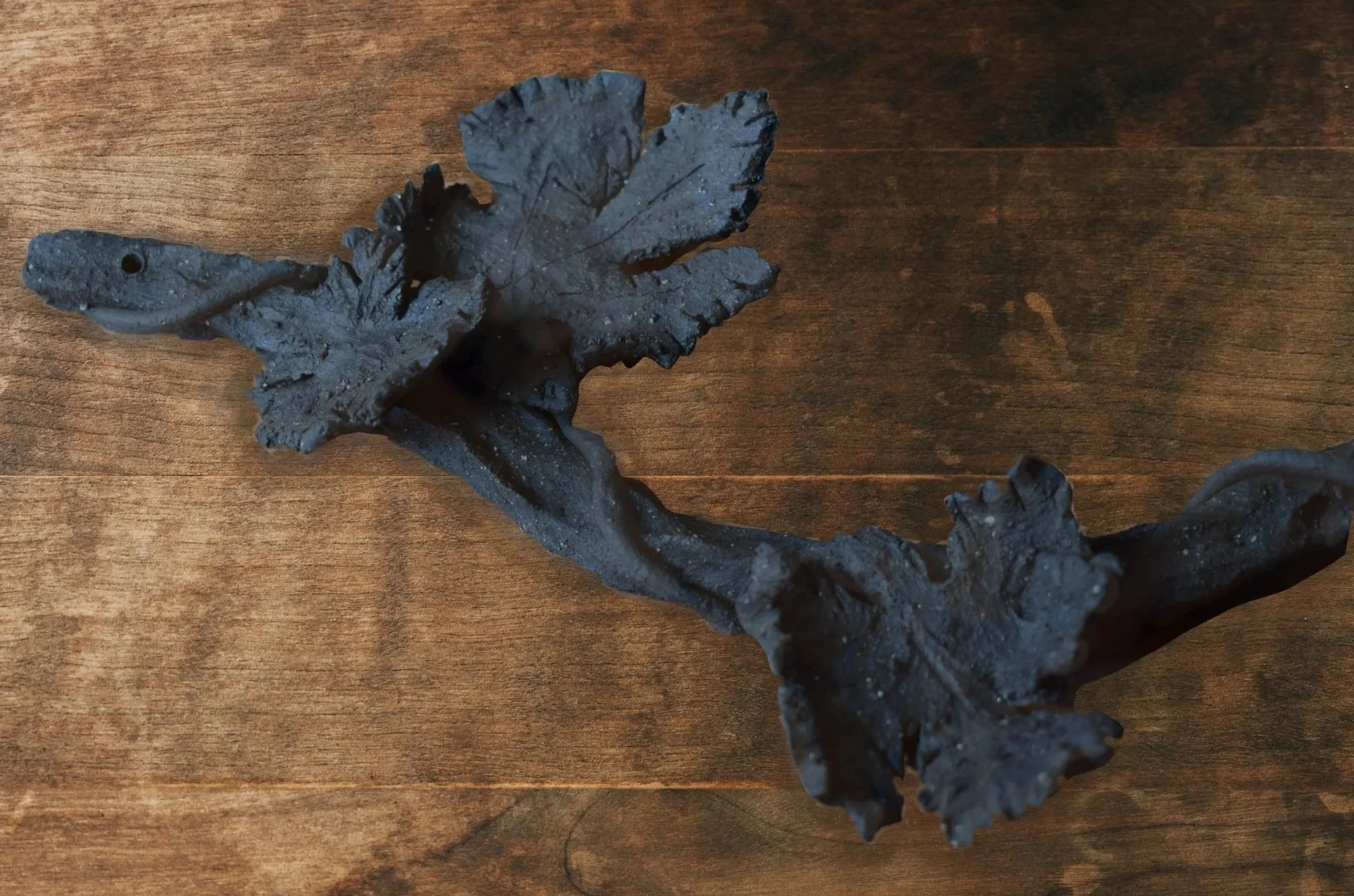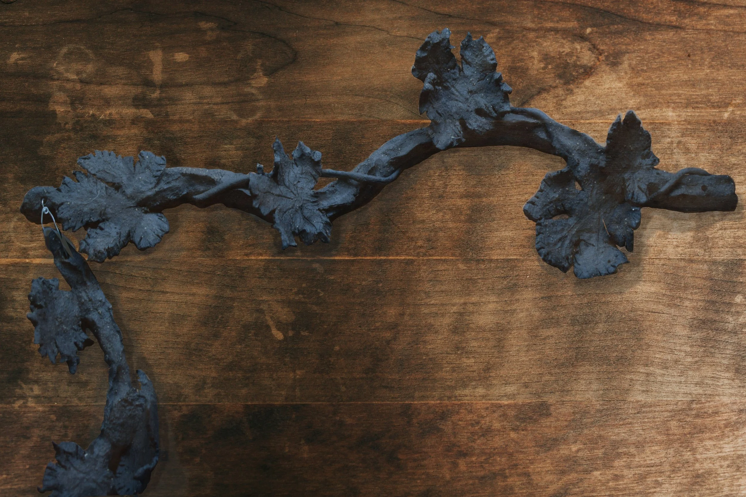 The vine is formed from dark brown stoneware clay with intricate details to resemble a real plant, and left unglazed to retain its coarse, organic texture. The process of making the grapes is delicate and time consuming: each grape is produced individually with a bit of metal wire inside, glazed with a brush and finally tied together to create a semi-realistic impression of a grape cluster.